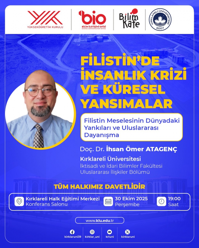 Üniversitemiz Bilim İletişimi Ofisi tarafından, Yükseköğretim Kurulu (YÖK) Bilim Kafe etkinlikleri kapsamında “Filistin Meselesi” başlıklı iki ayrı konferans düzenlenecektir.