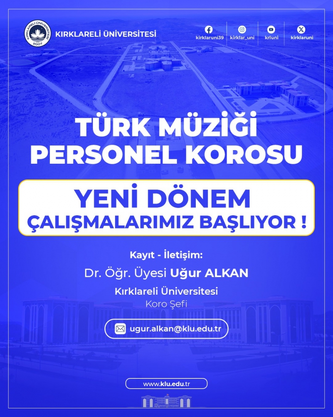 Katılmak isteyen personelimizin, Koro Şefi Dr. Öğr. Üyesi Uğur Alkan ile ugur.alkan@klu.edu.tr adresi üzerinden iletişime geçmeleri rica olunur.