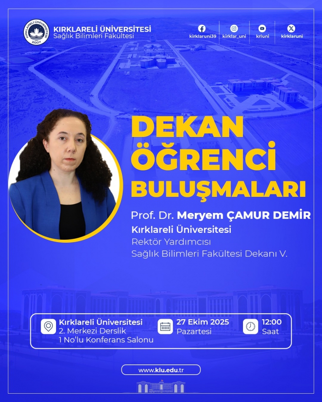 Etkinlik, 27 Ekim 2025 Pazartesi günü saat 12.00’de, Kırklareli Üniversitesi 2. Merkezi Derslik 1 No’lu Konferans Salonu’nda, Rektör Yardımcımız ve Sağlık Bilimleri Fakültesi Dekan Vekili Prof. Dr. Meryem Çamur Demir’in katılımıyla gerçekleştirilecektir.