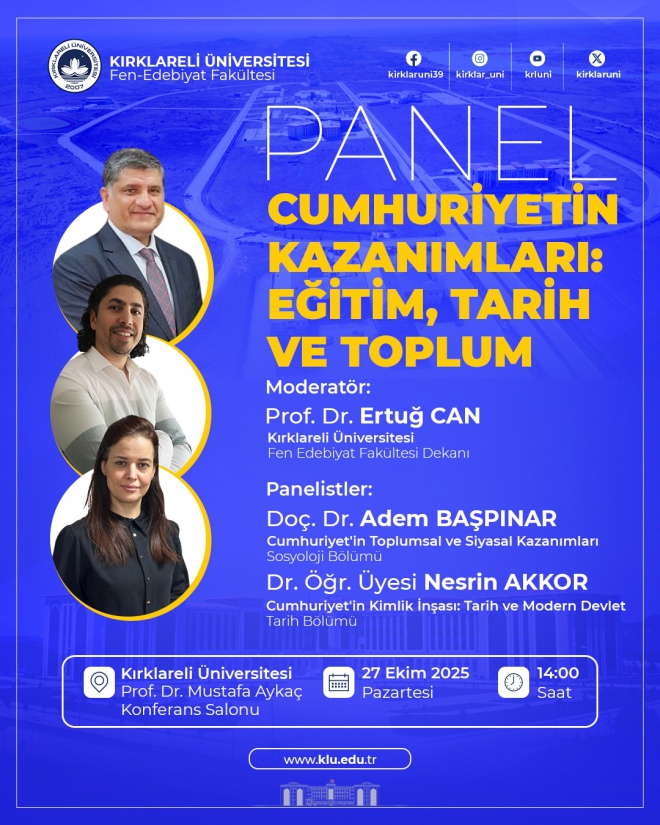 Üniversitemiz Fen-Edebiyat Fakültesi tarafından “Cumhuriyetin Kazanımları: Eğitim, Tarih ve Toplum” başlıklı panel düzenlenecektir.
