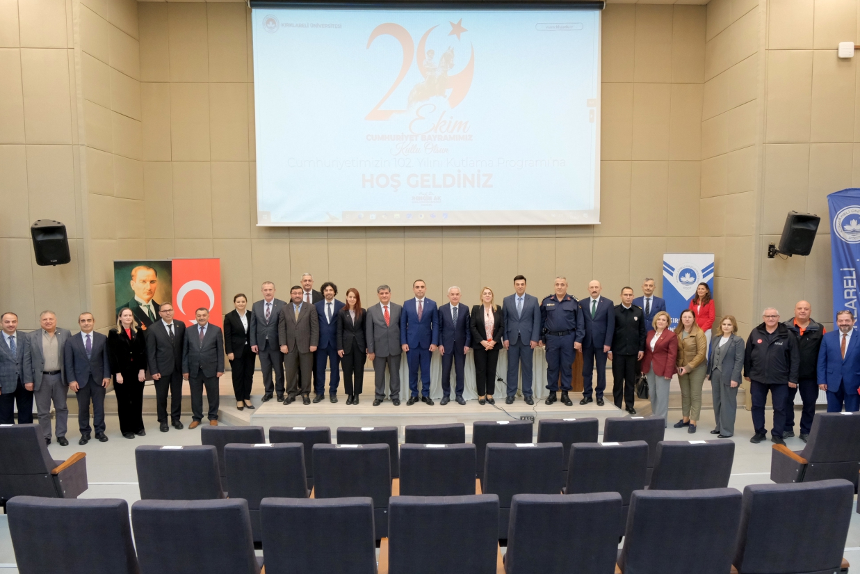Üniversitemiz tarafından Cumhuriyetimizin 102. yılı dolayısıyla düzenlenen “29 Ekim Cumhuriyet Bayramı Programı”, 27 Ekim 2025 Pazartesi günü Kırklareli Valisi Uğur Turan, Cumhuriyet Başsavcı Vekili İsmet Saçlı, İdare Mahkemesi Başkanı İbrahim Doğan, Rektörümüz Prof. Dr. Rengin Ak ve İl Protokolünün katılımlarıyla gerçekleştirildi.