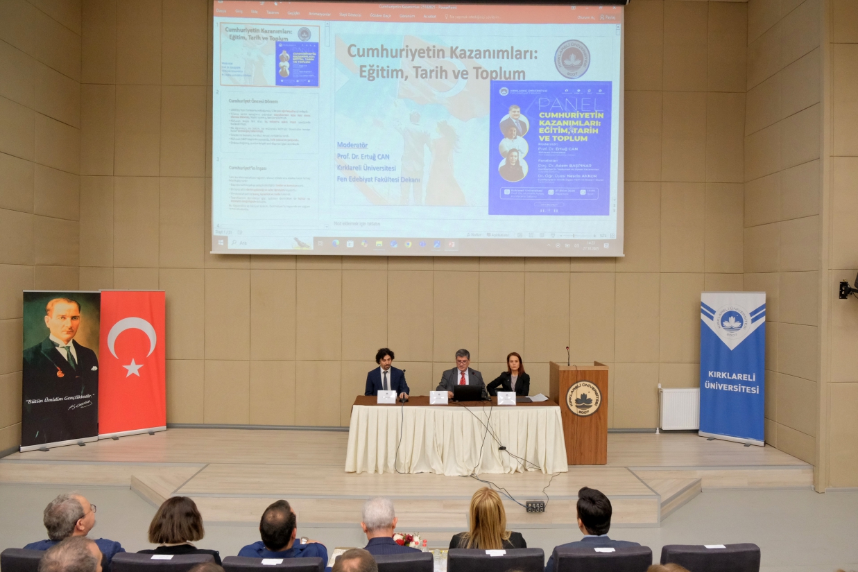 Program, “Cumhuriyetin Kazanımları: Eğitim, Tarih ve Toplum” başlıklı panelle devam etti. Moderatörlüğünü Fen-Edebiyat Fakültesi Dekanı Prof. Dr. Ertuğ Can’ın yaptığı panelde, Doç. Dr. Adem Başpınar ve Dr. Öğr. Üyesi Nesrin Akkor konuşmacı olarak yer aldı. Panelde, Cumhuriyet dönemi eğitim politikaları, toplumsal dönüşüm süreçleri ve modernleşme hareketleri üzerine değerlendirmelerde bulunuldu.