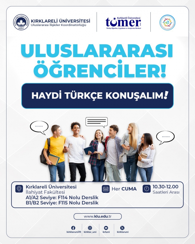 Uluslararası İlişkiler Koordinatörlüğü ve Türkçe Öğretim Uygulama ve Araştırma Merkezi (TÖMER) iş birliğinde, uluslararası öğrencilerimizin Türkçe konuşma becerilerini geliştirmelerine katkı sağlamak amacıyla “Haydi Türkçe Konuşalım!” etkinliği başlıyor.