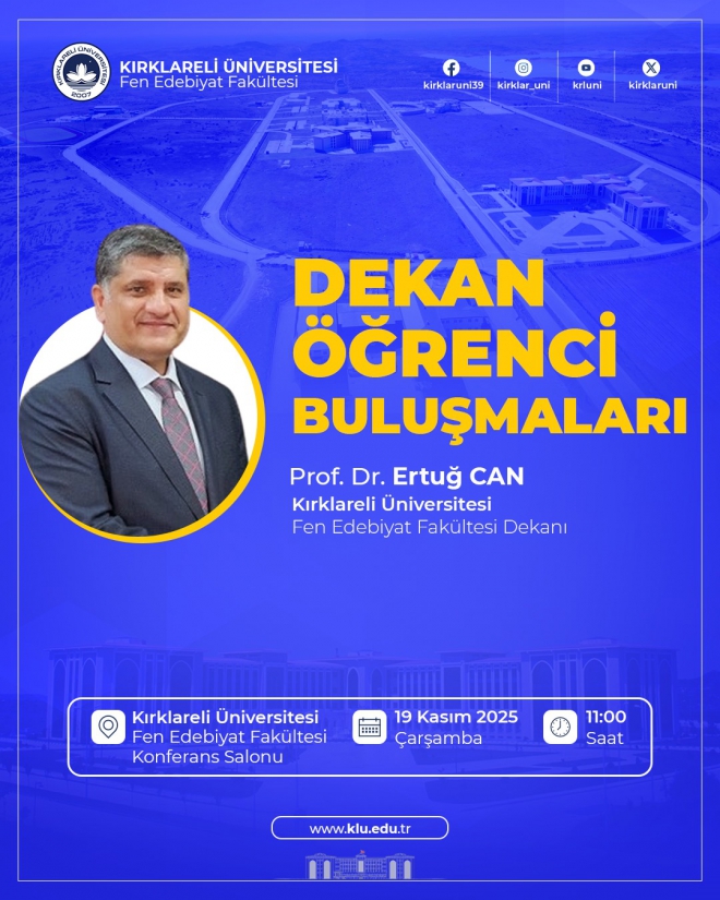 Üniversitemiz Fen-Edebiyat Fakültesi tarafından, öğrenciler ile fakülte yönetimi arasında doğrudan iletişimi güçlendirmek, akademik ve idari süreçlere ilişkin görüş alışverişinde bulunmak amacıyla “Dekan–Öğrenci Buluşması” etkinliği düzenlenecektir.