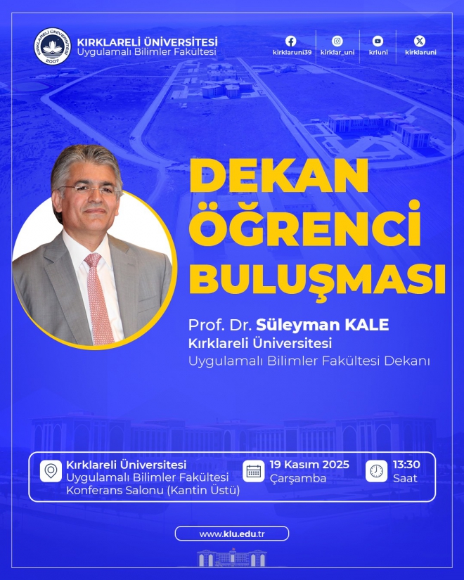 Üniversitemiz Uygulamalı Bilimler Fakültesi tarafından, öğrenciler ile fakülte yönetimi arasında doğrudan iletişimi güçlendirmek, akademik ve idari süreçlere ilişkin görüş alışverişinde bulunmak amacıyla “Dekan–Öğrenci Buluşması” etkinliği düzenlenecektir.