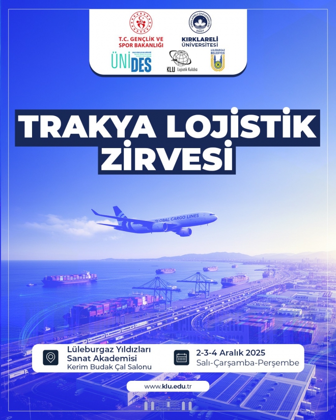 Üniversitemiz, Kırklareli Gençlik ve Spor İl Müdürlüğü, Lüleburgaz Belediyesi, ÜNİDES ve KLÜ Lojistik Kulübü iş birliğinde gerçekleştirilecek olan “Trakya Lojistik Zirvesi”, 2–4 Aralık 2025 tarihleri arasında Lüleburgaz Yıldızları Sanat Akademisi Kerim Budak Çal Salonunda düzenlenecektir.