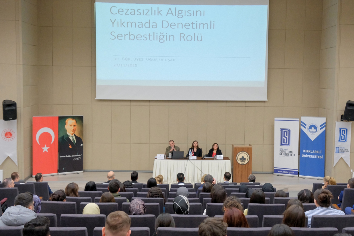 Konferans, Hukuk Fakültesi öğretim üyesi Dr. Öğr. Üyesi Tuğçe Isayev moderatörlüğünde gerçekleştirildi. Etkinlikte, Hukuk Fakültesi öğretim üyesi Dr. Öğr. Üyesi Uğur Uruşak tarafından “Cezasızlık Algısını Yıkmada Denetimli Serbestliğin Rolü”, Kırklareli Denetimli Serbestlik Müdürlüğü personeli Psikolog Fulya Mert tarafından ise “Ceza Yargılamasında Denetimli Serbestlik Sistemi” başlıklı sunumlar yapıldı.