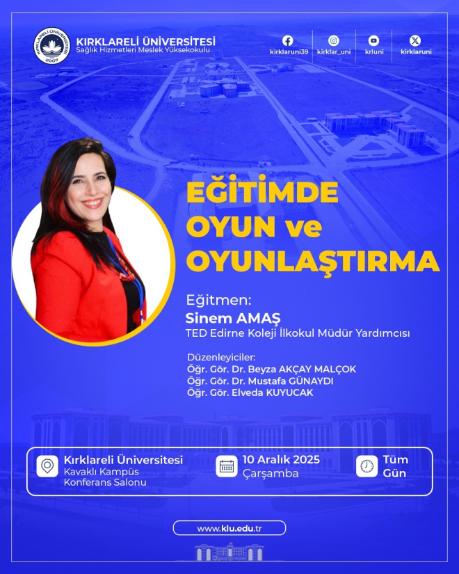 Üniversitemiz Sağlık Hizmetleri Meslek Yüksekokulu tarafından TED Edirne Koleji İlkokul Müdür Yardımcısı Sinem Amaş’ın konuşmacı olarak yer alacağı “Eğitimde Oyun ve Oyunlaştırma” konu başlıklı konferans düzenlenecektir.