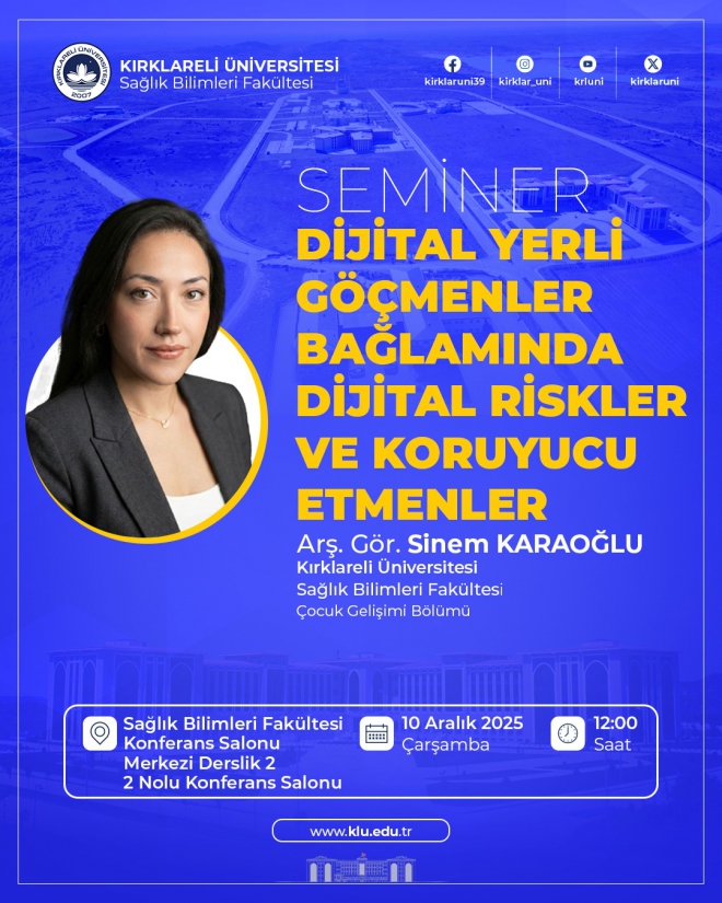 Üniversitemiz Sağlık Bilimleri Fakültesi tarafından Çocuk Gelişimi Bölümünden Arş. Gör. Sinem Karaoğlu’nun konuşmacı olarak yer alacağı “Dijital Yerli Göçmenler Bağlamında Dijital Riskler ve Koruyucu Etmenler” konu başlıklı seminer düzenlenecektir.
