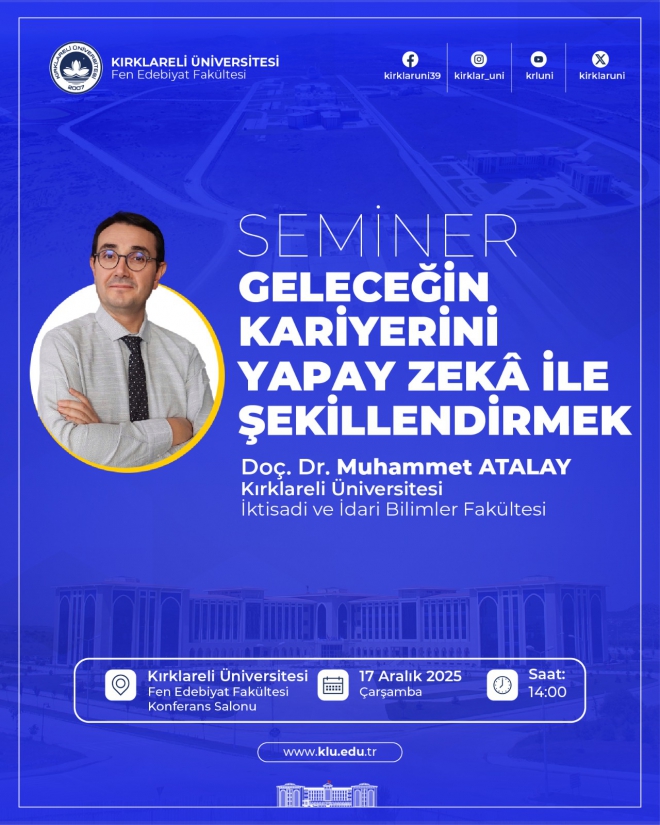 Üniversitemiz Fen Edebiyat Fakültesi Sosyoloji bölümü tarafından, 17 Aralık 2025 Çarşamba günü saat 14:00’te İktisadi ve İdari Bilimler Fakültesi’nden Doç. Dr. Muhammet Atalay’ın konuşmacı olarak yer alacağı “Geleceğin Kariyerini Yapay Zeka İle Şekillendirmek” konu başlıklı seminer gerçekleşecektir.