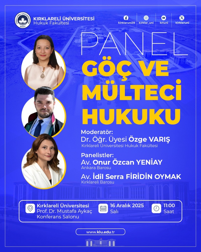 Üniversitemiz Hukuk Fakültesi tarafından, 16 Aralık Salı günü saat 11:00’de Hukuk Fakültesi’nden Dr. Öğr. Üyesi Özge Varış’ın moderatörlüğü ile “Göç ve Mülteci Hukuku” konu başlıklı panel gerçekleştirilecektir.