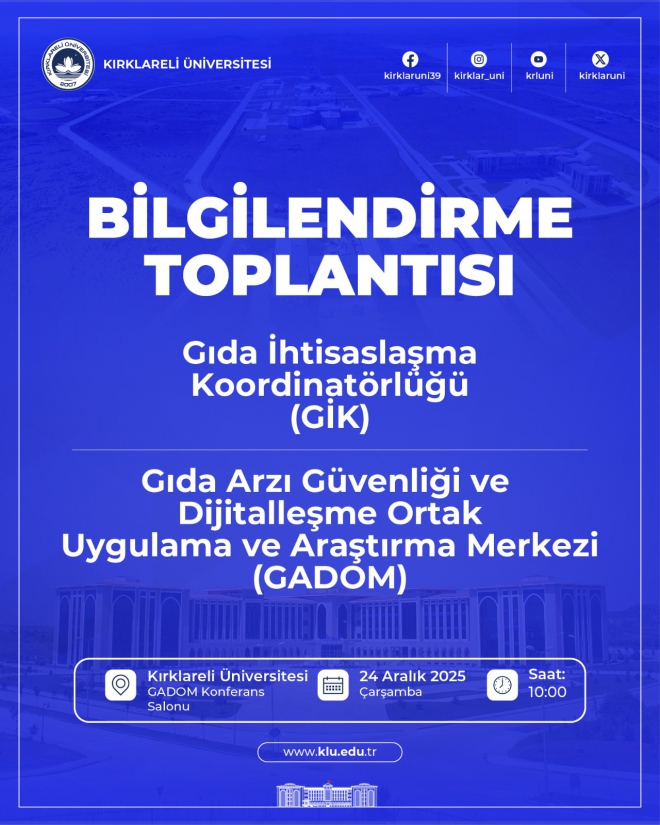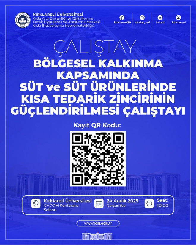 Üniversitemiz Gıda İhtisaslaşma Koordinatörlüğü ile Gıda Arzı Güvenliği ve Dijitalleşme Ortak Uygulama ve Araştırma Merkezi işbirliğinde “Bölgesel Kalkınma Kapsamında Süt ve Süt Ürünlerinde Kısa Tedarik Zincirinin Güçlendirilmesi Çalıştayı” ve “Bilgilendirme Toplantısı” düzenlenecektir.