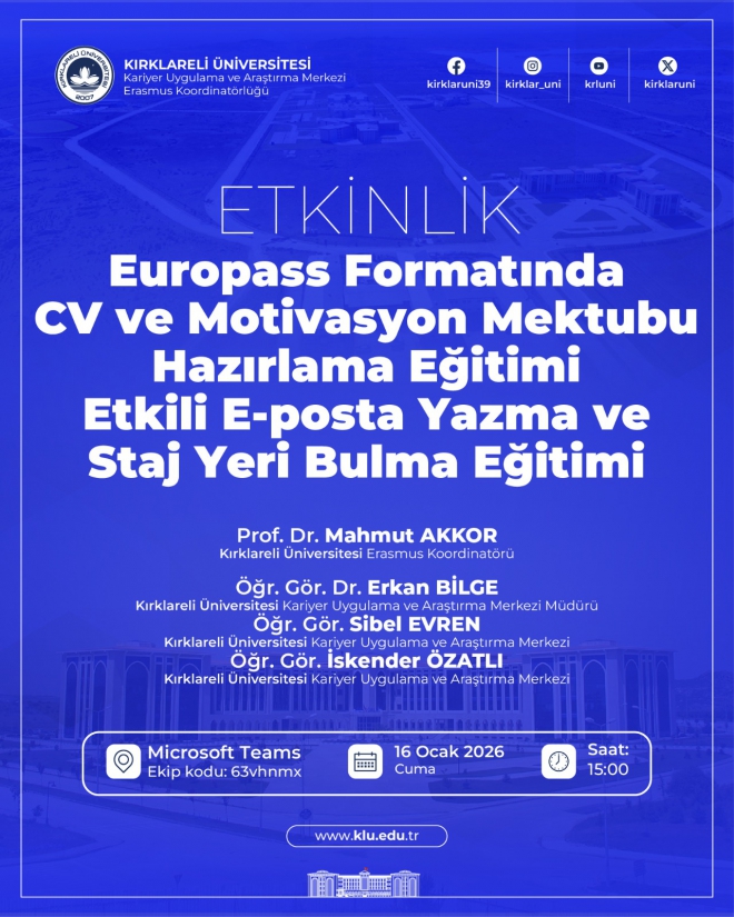 Üniversitemiz Kariyer Uygulama ve Araştırma Merkezi ile Erasmus Koordinatörlüğü tarafından, öğrencilerimizin kariyer planlamalarına ve uluslararası hareketlilik süreçlerine katkı sağlamak amacıyla “Europass Formatında CV ve Motivasyon Mektubu Hazırlama, Etkili E-posta Yazma ve Staj Yeri Bulma Eğitimi” düzenlenecektir.