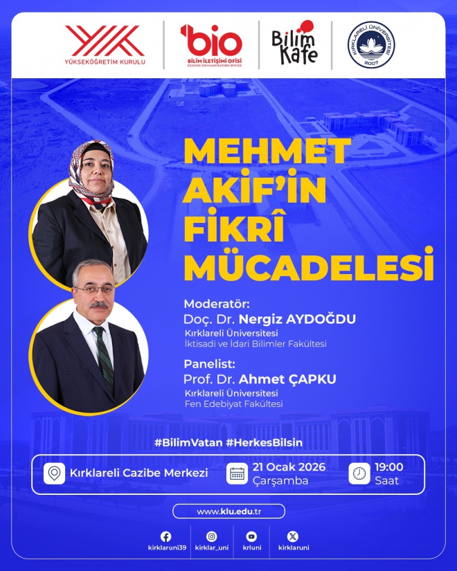 Üniversitemiz Bilim İletişimi Ofisi tarafından, Yükseköğretim Kurulu (YÖK) Bilim Kafe etkinlikleri kapsamında “Mehmet Akif’in Fikri Mücadelesi” başlıklı panel düzenlenecektir.