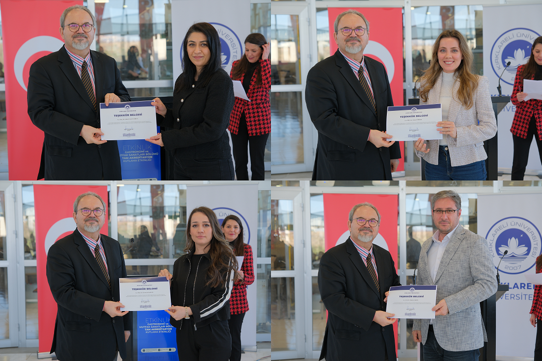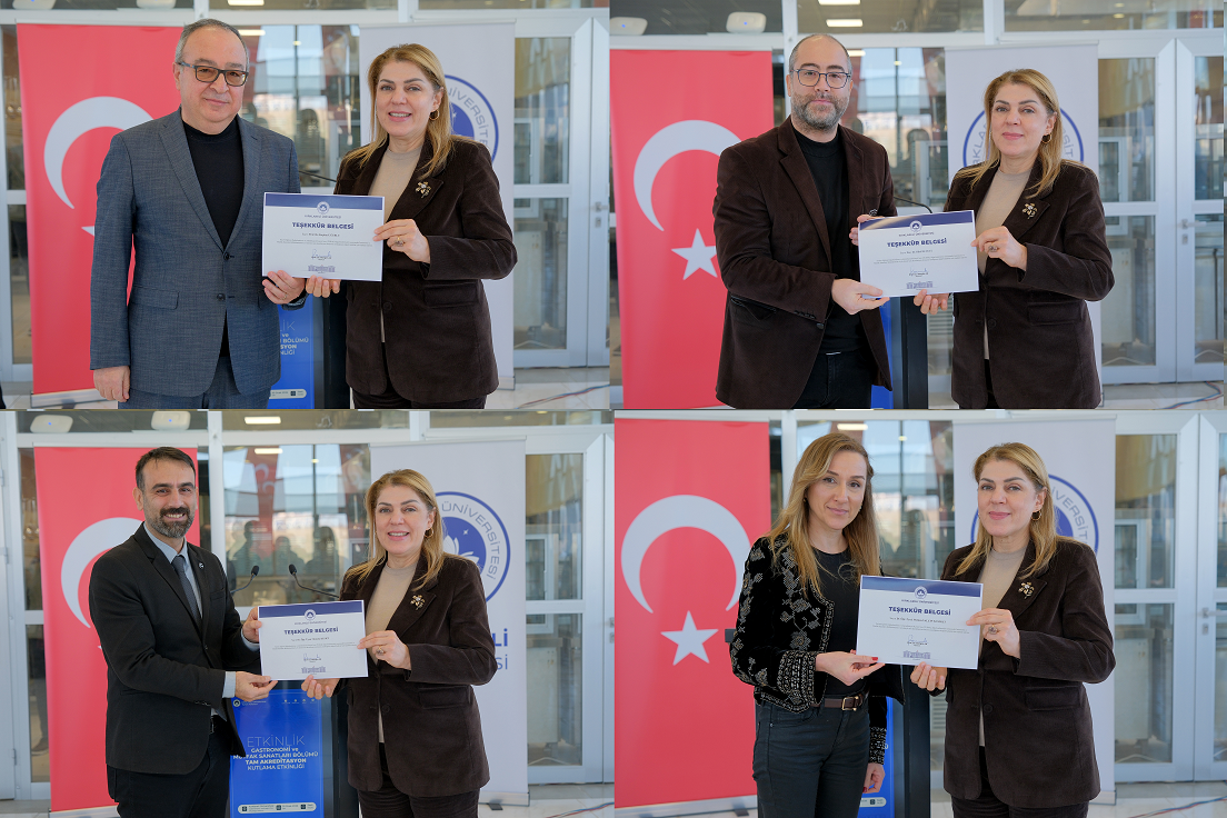 Gastronomi Araştırma ve Uygulama Mutfağı’nda düzenlenen törene, Rektörümüz Prof. Dr. Rengin Ak, Rektör Yardımcılarımız Prof. Dr. Eylem Özkaya Lassalle, Prof. Dr. Murat Gençbay ve Prof. Dr. Meryem Çamur Demir, Rektör Danışmanlarımız Prof. Dr. Seçkin Yavuzdoğan ve Doç. Dr. İskender Gümüş, Genel Sekreterimiz Ahmet Şimşek, Uluslararası İlişkiler Koordinatörü Doç. Dr. Berna Ak Bingül ile akademik ve idari personelimiz katıldı.