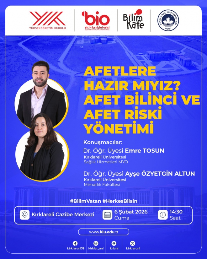 Üniversitemiz Bilim İletişimi Ofisi tarafından, Yükseköğretim Kurulu (YÖK) Bilim Kafe etkinlikleri kapsamında “Afetlere Hazır mıyız? Afet Bilinci ve Afet Riski Yönetimi” başlıklı söyleşi düzenlenecektir.