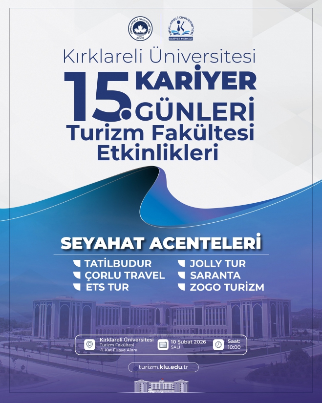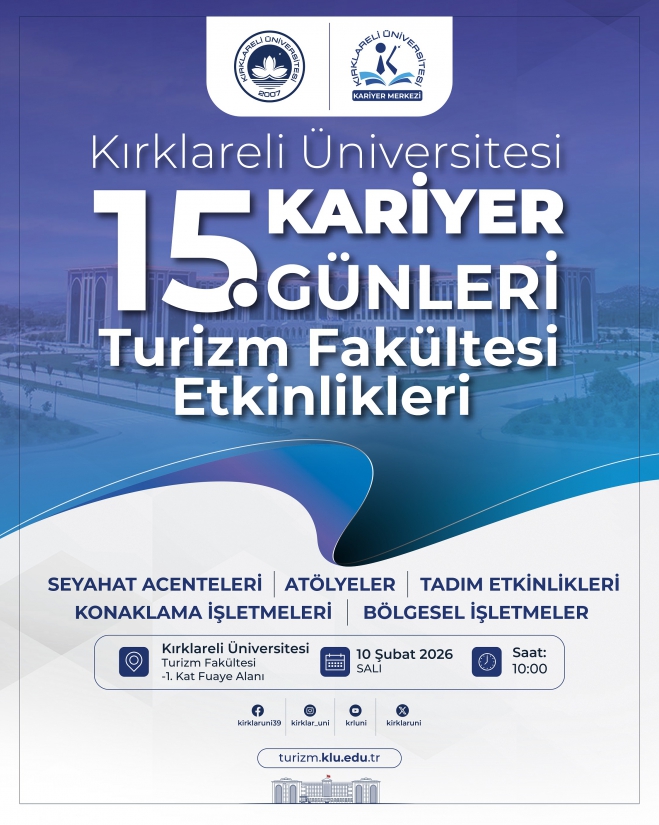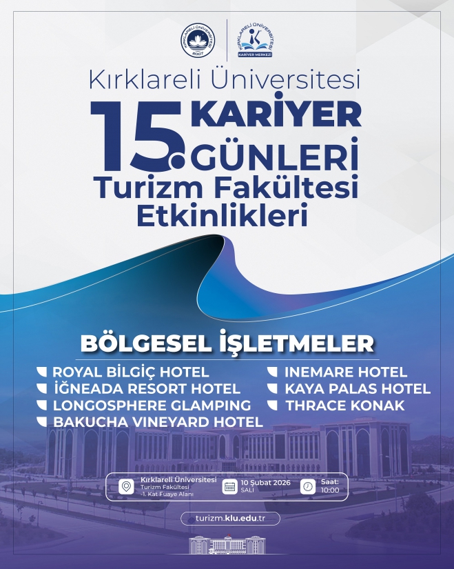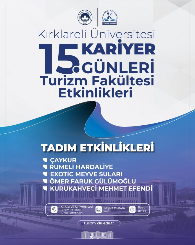 15. Kariyer Günleri Turizm Fakültesi Etkinlikleri, 10 Şubat 2026 Salı günü saat 10.00’da, Kırklareli Üniversitesi Turizm Fakültesi -1. Kat Fuaye Alanı’nda gerçekleştirilecektir.