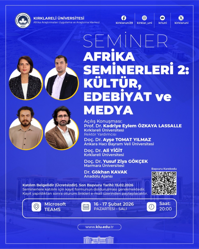 Üniversitemiz Afrika Araştırmaları Uygulama ve Araştırma Merkezi tarafından düzenlenen “Afrika Seminerleri 2: Kültür, Edebiyat ve Medya” başlıklı etkinlik, alanında uzman akademisyen ve medya temsilcilerinin katılımıyla çevrim içi olarak gerçekleştirilecektir.