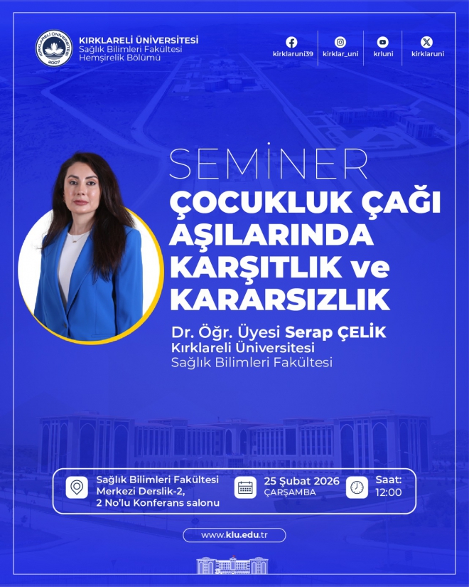 Üniversitemiz Sağlık Bilimleri Fakültesi Hemşirelik Bölümü tarafından “Çocukluk Çağı Aşılarında Karşıtlık ve Kararsızlık” konu başlıklı seminer düzenlenecektir.