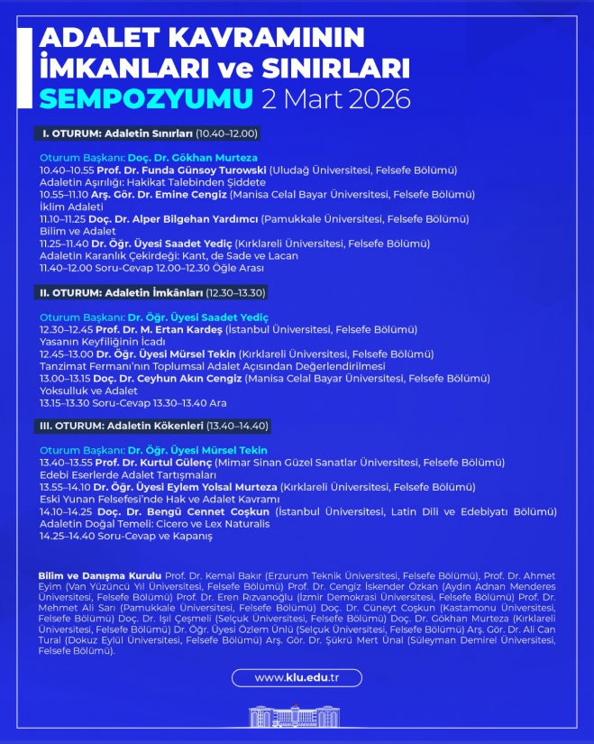 Adalet kavramının felsefi, hukuki, toplumsal ve etik boyutlarıyla ele alınacağı sempozyumda, alanında uzman akademisyenler tarafından kavramın teorik çerçevesi, uygulamadaki yansımaları ve güncel tartışmaları değerlendirilecektir.