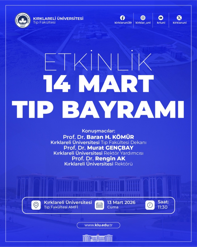 Üniversitemiz Tıp Fakültesi tarafından 14 Mart Tıp Bayramı dolayısıyla 13 Mart 2026 Cuma günü saat 11.30’da, Tıp Fakültesi Amfisi’nde Tıp Bayramı etkinliği düzenlenecektir.