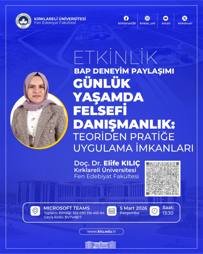 Doç. Dr. Elife KILIÇ’ın konuşmacı olarak yer alacağı etkinlikte; felsefi danışmanlığın kuramsal temelleri, günlük yaşamla kurduğu ilişki ve uygulama alanlarına dair deneyim paylaşımında bulunulacaktır. Program kapsamında ayrıca BAP süreçlerine ilişkin akademik tecrübe aktarımı da yapılacaktır.