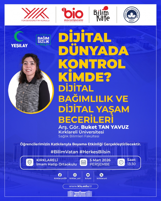 1–7 Mart tarihleri arası Yeşilay Haftası kapsamında, Bilim İletişim Ofisi ve Bağımlılıkla Mücadele Koordinatörlüğü tarafından çocuklarımızın bilinçlendirilmesine katkı sağlamak amacıyla “Dijital Dünyada Kontrol Kimde? Dijital Bağımlılık ve Dijital Yaşam Becerileri" başlıklı Bilim Kafe etkinliği düzenlenecektir.