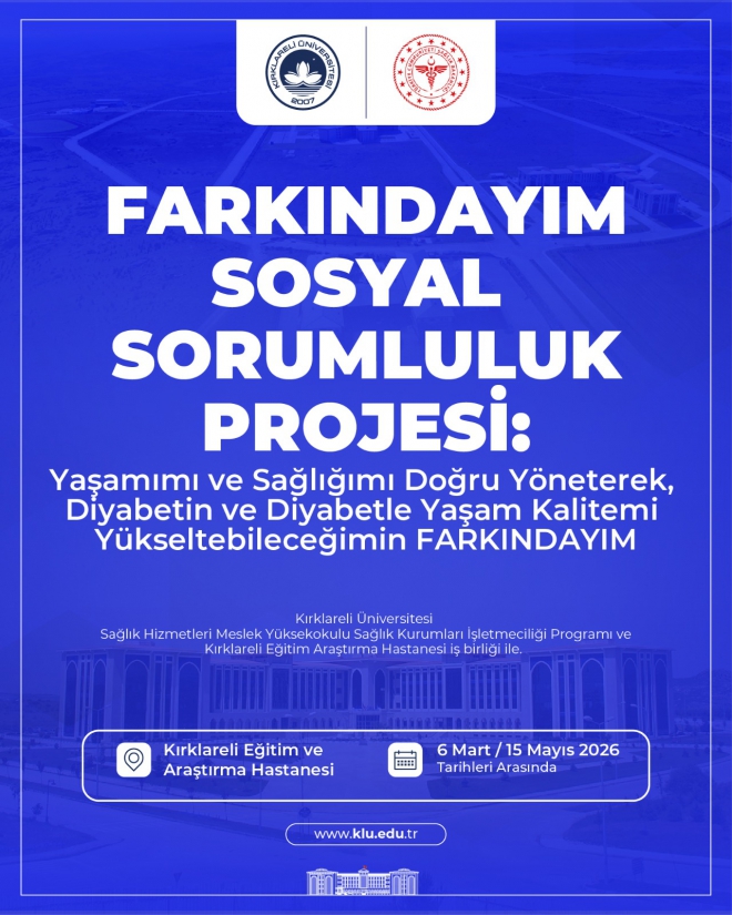 Üniversitemiz Sağlık Hizmetleri Meslek Yüksekokulu Sağlık Kurumları İşletmeciliği Programı ile Kırklareli Eğitim ve Araştırma Hastanesi iş birliğinde “FARKINDAYIM Sosyal Sorumluluk Projesi: Yaşamımı ve Sağlığımı Doğru Yöneterek, Diyabetin ve Diyabetle Yaşam Kalitemi Yükseltebileceğimin FARKINDAYIM” başlıklı sosyal sorumluluk projesi gerçekleştirilecektir.