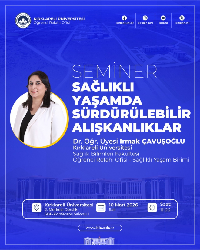 Üniversitemiz Öğrenci Refahı Ofisi tarafından “Sağlıklı Yaşamda Sürdürülebilir Alışkanlıklar” başlıklı seminer düzenlenecektir.