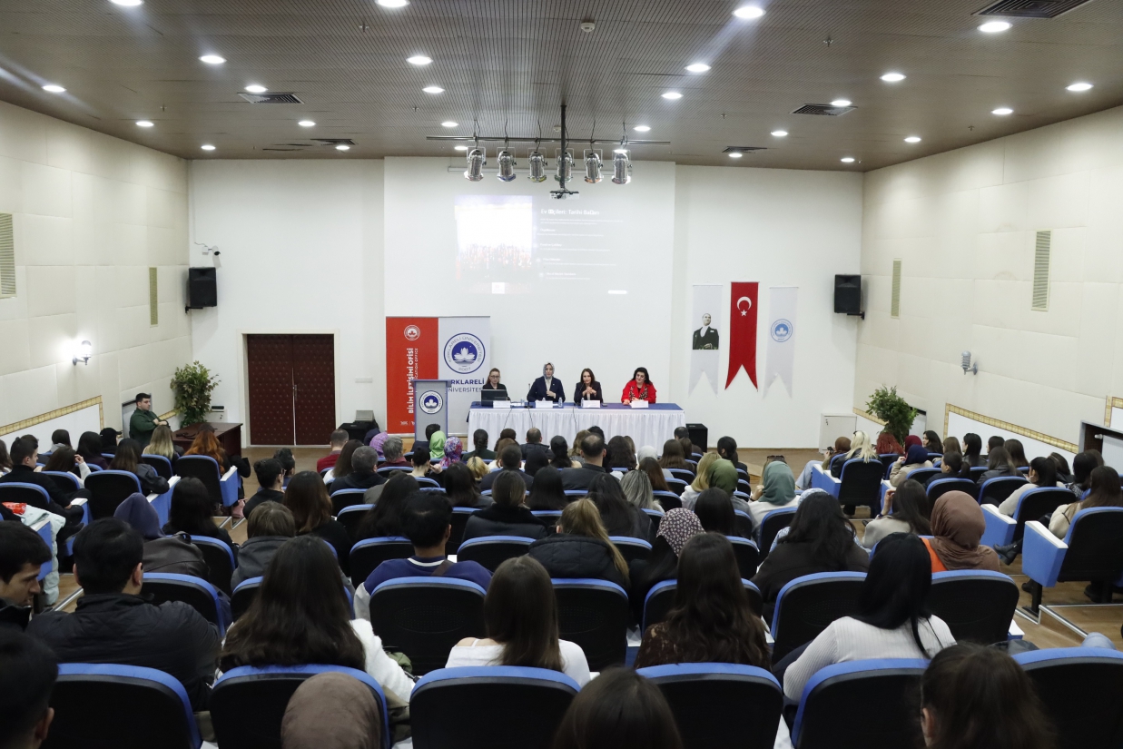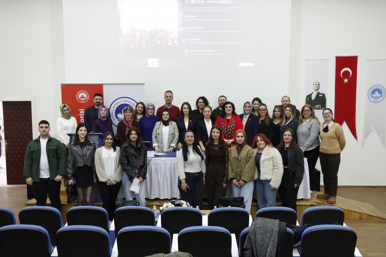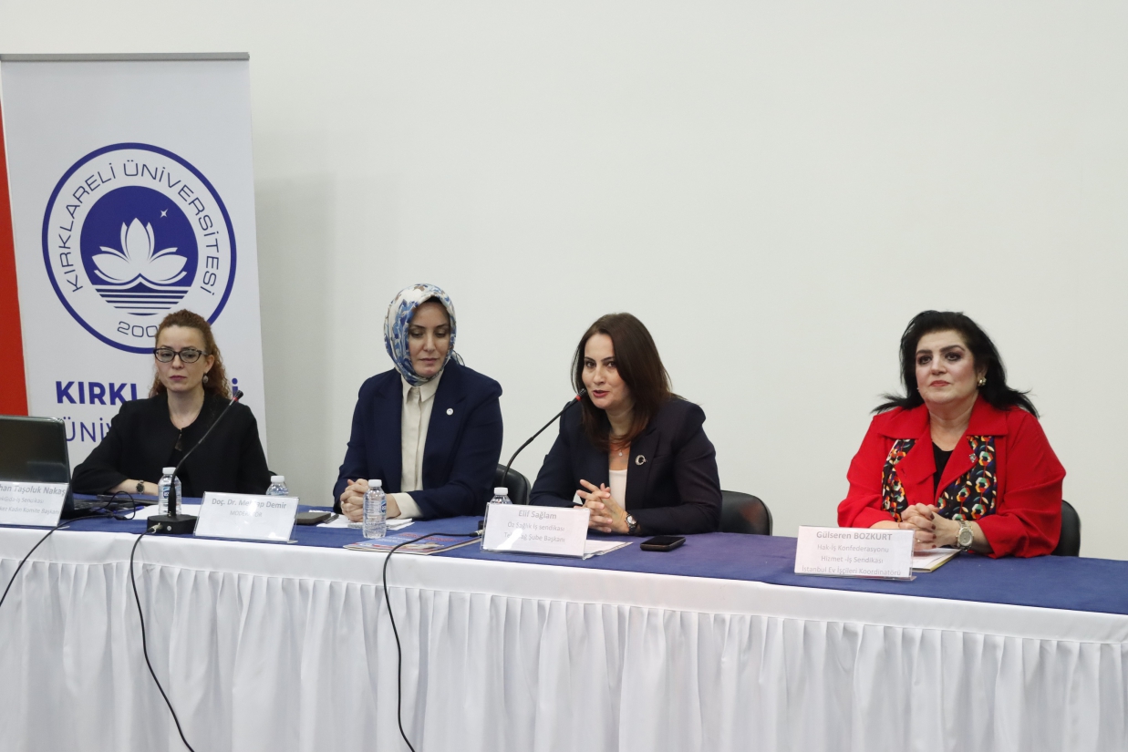 Programın moderatörlüğünü Üniversitemiz İktisadi ve İdari Bilimler Fakültesi öğretim üyesi Doç. Dr. Mehtap Demir üstlendi. Etkinlikte konuşmacı olarak Tek Gıda-İş Sendikası Genel Merkez Kadın Komite Başkanı Neslihan Taşoluk Nakaş, Öz Sağlık-İş Sendikası Tekirdağ Şube Başkanı Elif Sağlam ve Hak-İş Konfederasyonu Hizmet-İş Sendikası İstanbul Ev İşçileri Koordinatörü Gülseren Bozkurt yer aldı.
