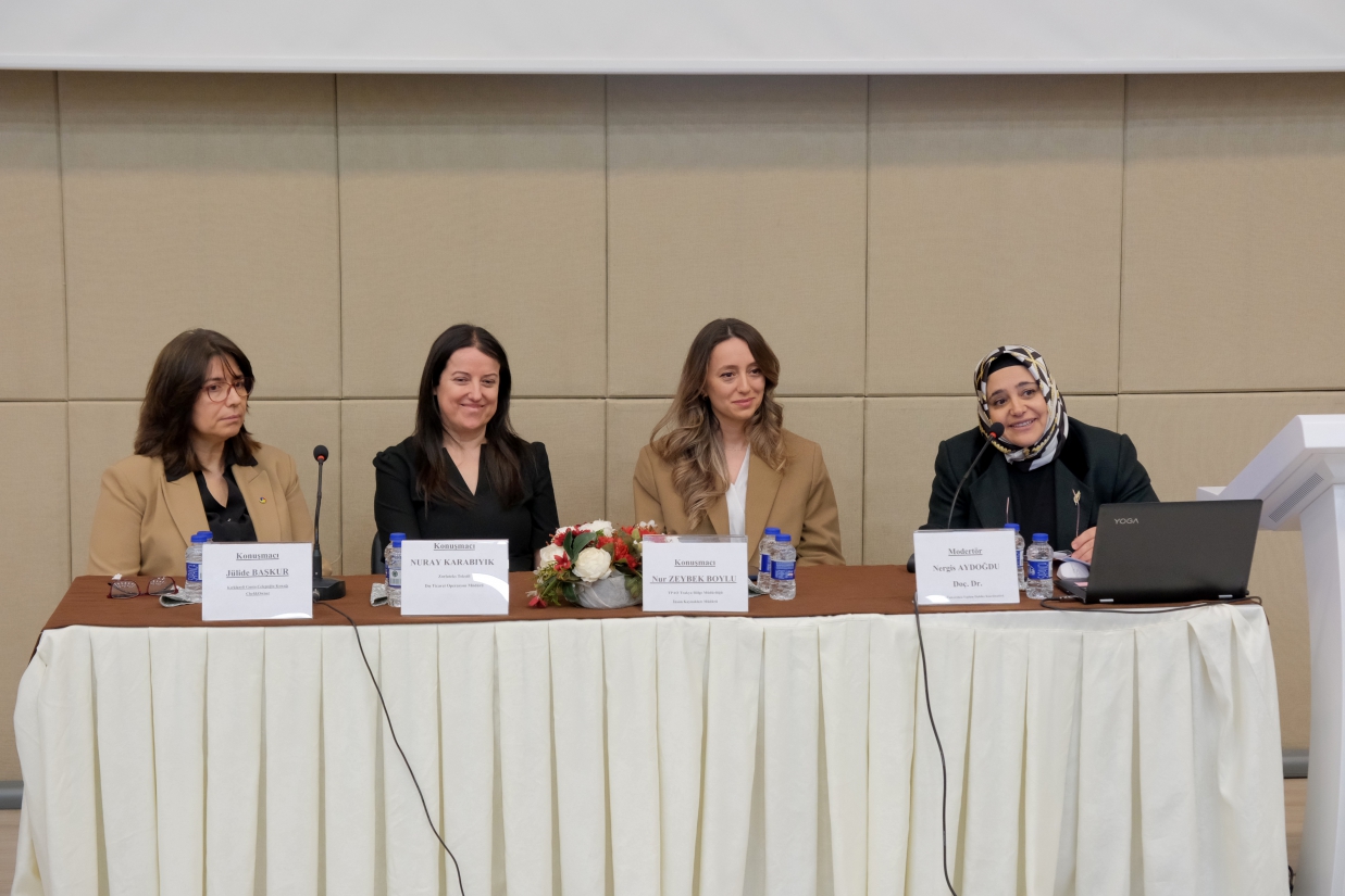Program, saygı duruşu ve İstiklal Marşı’nın okunmasının ardından Kadın ve Aile Çalışmaları Uygulama ve Araştırma Merkezi Müdürü Dr. Öğr. Üyesi Sibel Tokatlıoğlu’nun açılış konuşmasıyla başladı. Tokatlıoğlu konuşmasında kadınların iş hayatında daha görünür ve etkin roller üstlenmesinin toplumsal gelişim açısından büyük önem taşıdığını belirtti.