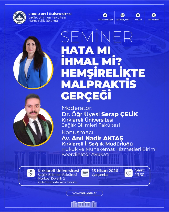 Üniversitemiz, Sağlık Bilimleri Fakültesi Hemşirelik Bölümü tarafından, “Hata mı İhmal mi? Hemşirelikte Malpraktis Gerçeği” konu başlıklı seminer düzenlenecektir.