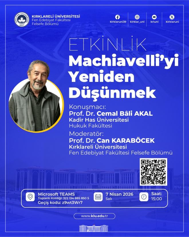 “Machiavelli’yi Yeniden Düşünmek” başlıklı etkinlikte, siyaset felsefesinin en etkili isimlerinden Machiavelli’nin fikirleri farklı yönleriyle ele alınacaktır. Etkinliğe, Kadir Has Üniversitesi Hukuk Fakültesi öğretim üyesi Prof. Dr. Cemal Bâli Akal konuşmacı olarak katılacaktır. Programın moderatörlüğünü ise Fen Edebiyat Fakültesi Felsefe Bölümü öğretim üyesi Prof. Dr. Can Karaböcek üstlenecektir.