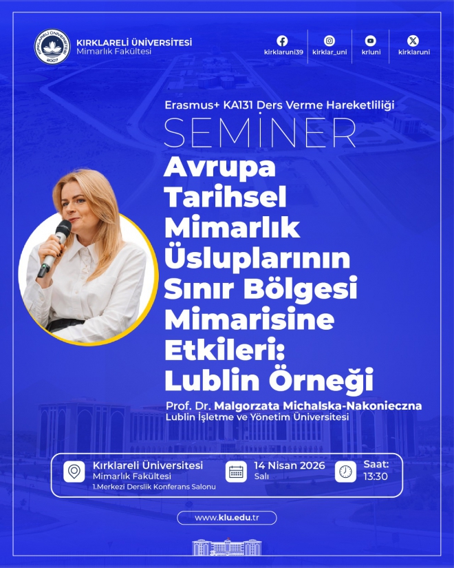 Üniversitemiz Mimarlık Fakültesi tarafından Erasmus+ KA131 Ders Verme Hareketliliği kapsamında “Avrupa Tarihsel Mimarlık Üsluplarının Sınır Bölgesi Mimarisine Etkileri: Lublin Örneği” konu başlıklı seminer düzenlenecektir.