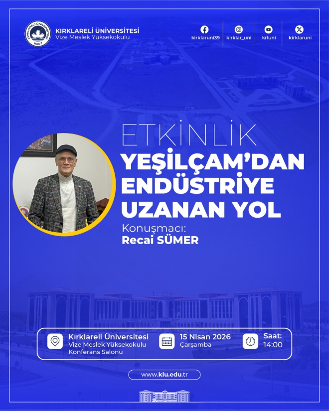 Üniversitemiz Vize Meslek Yüksekokulu tarafından “Yeşilçam’dan Endüstriye Uzanan Yol” konu başlıklı etkinlik düzenlenecektir.