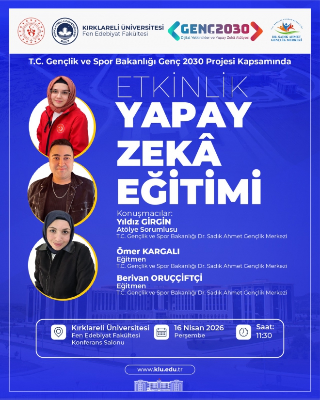 Üniversitemiz Fen Edebiyat Fakültesi tarafından, T.C. Gençlik ve Spor Bakanlığı Genç 2030 Projesi kapsamında “Yapay Zekâ Eğitimi” etkinliği düzenlenecektir.