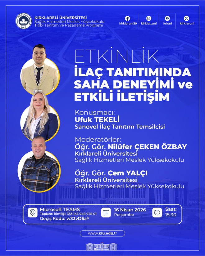 Üniversitemiz Sağlık Hizmetleri Meslek Yüksekokulu Tıbbi Tanıtım ve Pazarlama Programı tarafından “İlaç Tanıtımında Saha Deneyimi ve Etkili İletişim” konu başlıklı etkinlik düzenlenecektir.