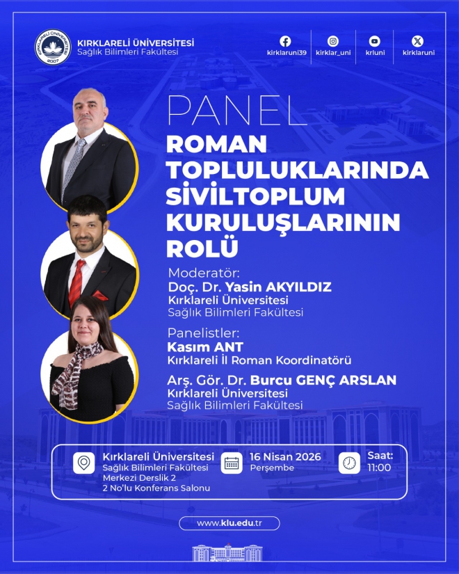 Moderatörlüğünü Sağlık Bilimleri Fakültesi öğretim üyesi Doç. Dr. Yasin Akyıldız’ın üstleneceği panelde Kırklareli İl Roman Koordinatörü Kasım Ant ile Sağlık Bilimleri Fakültesi öğretim elemanı Arş. Gör. Dr. Burcu Genç Arslan panelist olarak yer alacaktır.
