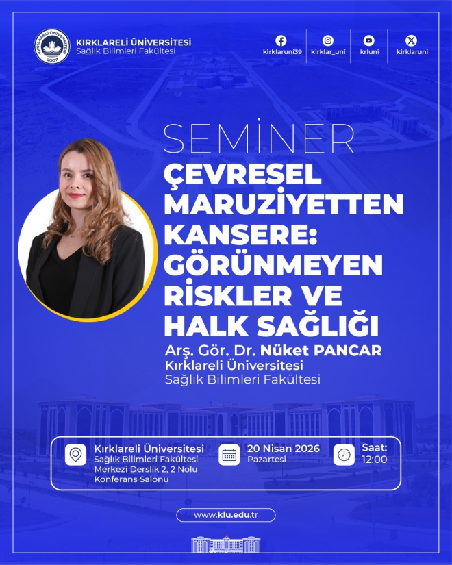 Seminerde, çevresel faktörlerin insan sağlığı üzerindeki etkileri ve kansere yol açabilecek görünmeyen riskler halk sağlığı perspektifiyle ele alınacaktır. Arş. Gör. Dr. Nüket Pancar’ın konuşmacı olarak yer alacağı etkinliğe, tüm akademik ve idari personelimiz ile öğrencilerimiz davetlidir.