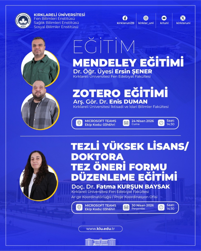 Üniversitemiz Fen Bilimleri Enstitüsü, Sağlık Bilimleri Enstitüsü ve Sosyal Bilimler Enstitüsü iş birliğinde, lisansüstü öğrencilerimize yönelik çevrim içi eğitim programı düzenlenecektir.