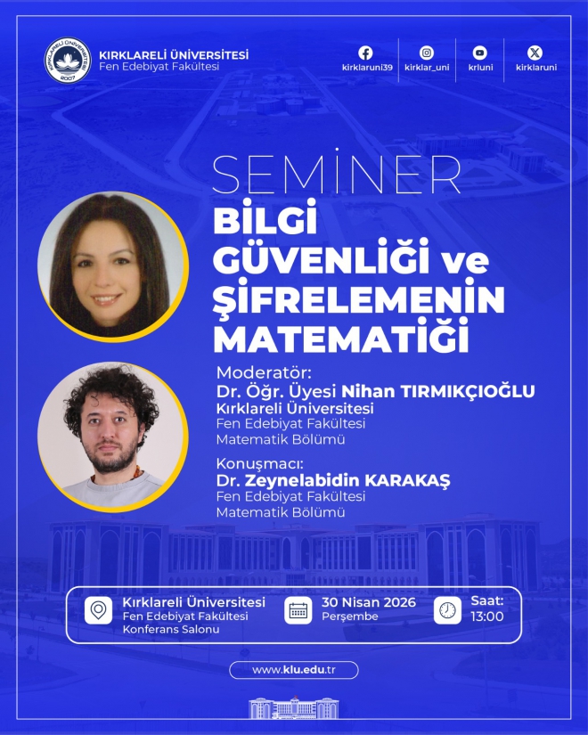 Üniversitemiz Fen Edebiyat Fakültesi tarafından, “Bilgi Güvenliği ve Şifrelemenin Matematiği” konu başlıklı seminer düzenlenecektir.