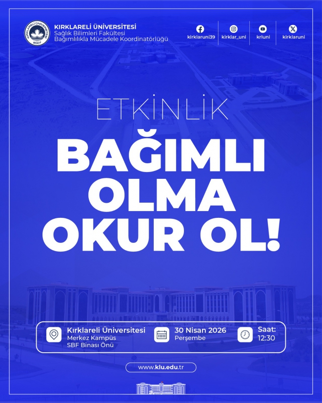 Üniversitemiz Sağlık Bilimleri Fakültesi ile Bağımlılıkla Mücadele Koordinatörlüğü tarafından “Bağımlı Olma Okur Ol!” konu başlıklı etkinlik düzenlenecektir.