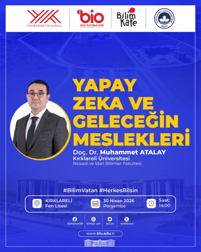 Üniversitemiz İktisadi ve İdari Bilimler Fakültesi’nden Doç. Dr. Muhammet Atalay’ın konuşmacı olarak yer alacağı etkinlikte, yapay zekânın iş dünyasına etkileri, geleceğin meslekleri ve bu dönüşüme uyum sağlama süreçleri ele alınacaktır.