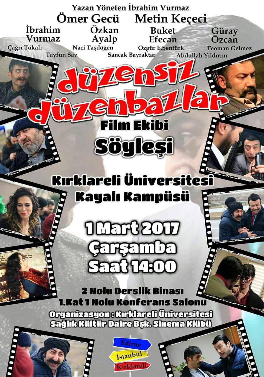 Yönetmenliğini ve senaryo yazarlığını İbrahim Vurmaz’ın yaptığı, çekimleri Kırklareli’nde ve Üniversitemiz Merkez Kampüsü civarında gerçekleştirilen “Düzensiz Düzenbazlar” adlı komedi-macera filminin yönetmen ve oyuncuları, Üniversitemizde düzenlenecek olan sinema söyleşisinde öğrenci ve personelimizle buluşuyor.